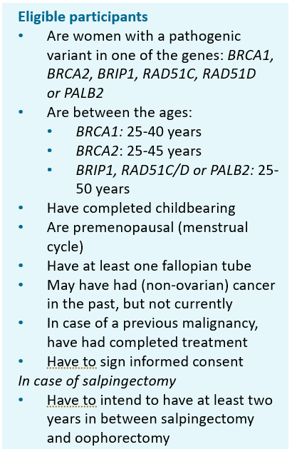 In the TUBA-WISP II study we investigate whether early removal of the fallopian tubes with delayed removal of the ovaries (experimental method) is as safe as the simultaneous removal of the fallopian tubes and ovaries (standard method) in women at high inherited risk for ovarian cancer. Safe means that the risk of ovarian cancer is equally low after both methods.